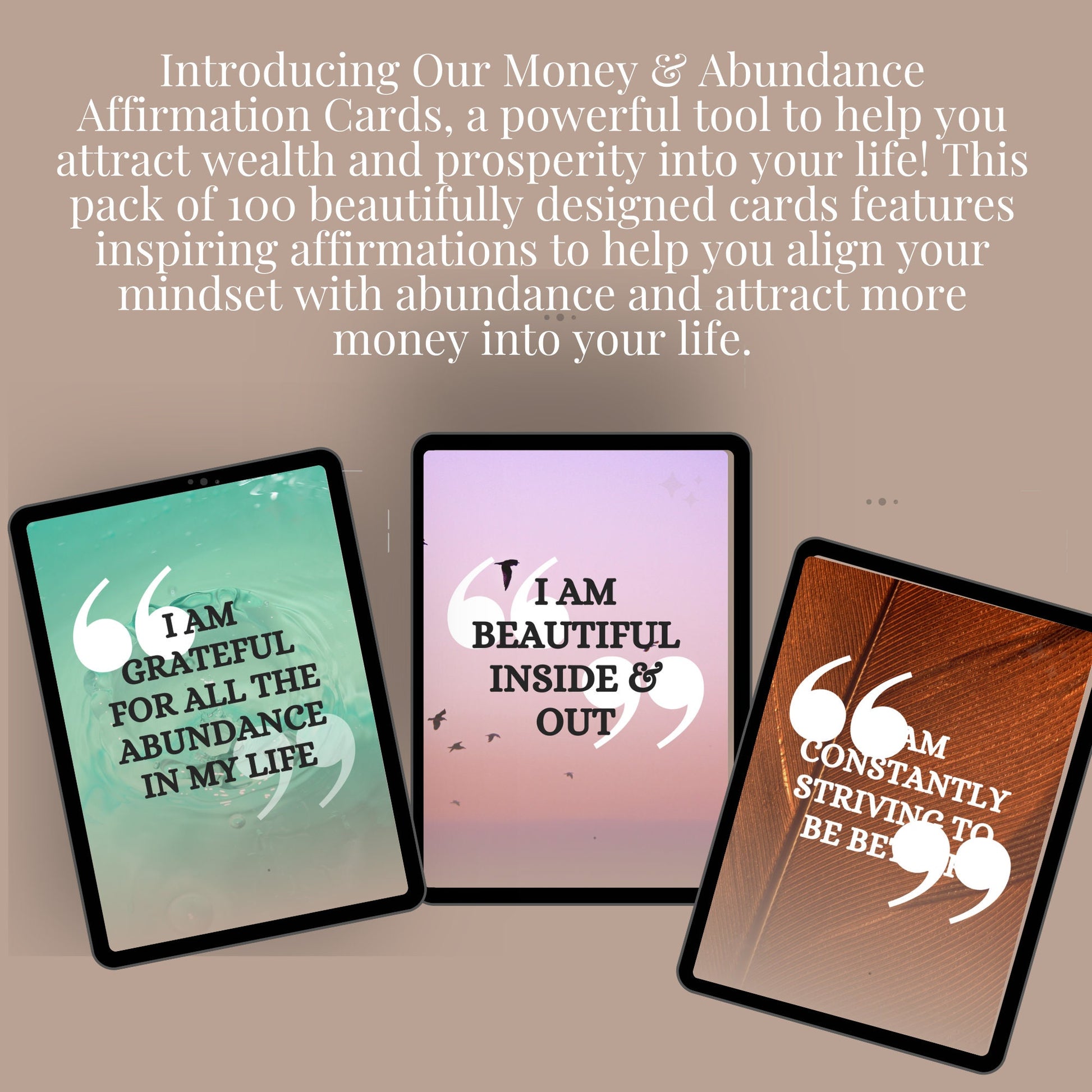Introducing our Money & Abundance Affirmation Cards, a powerful tool to help you attract wealth and prosperity into your life! This pack of 100 beautifully designed cards features inspiring affirmations to help you align your mindset with abundance and attract more money into your life.