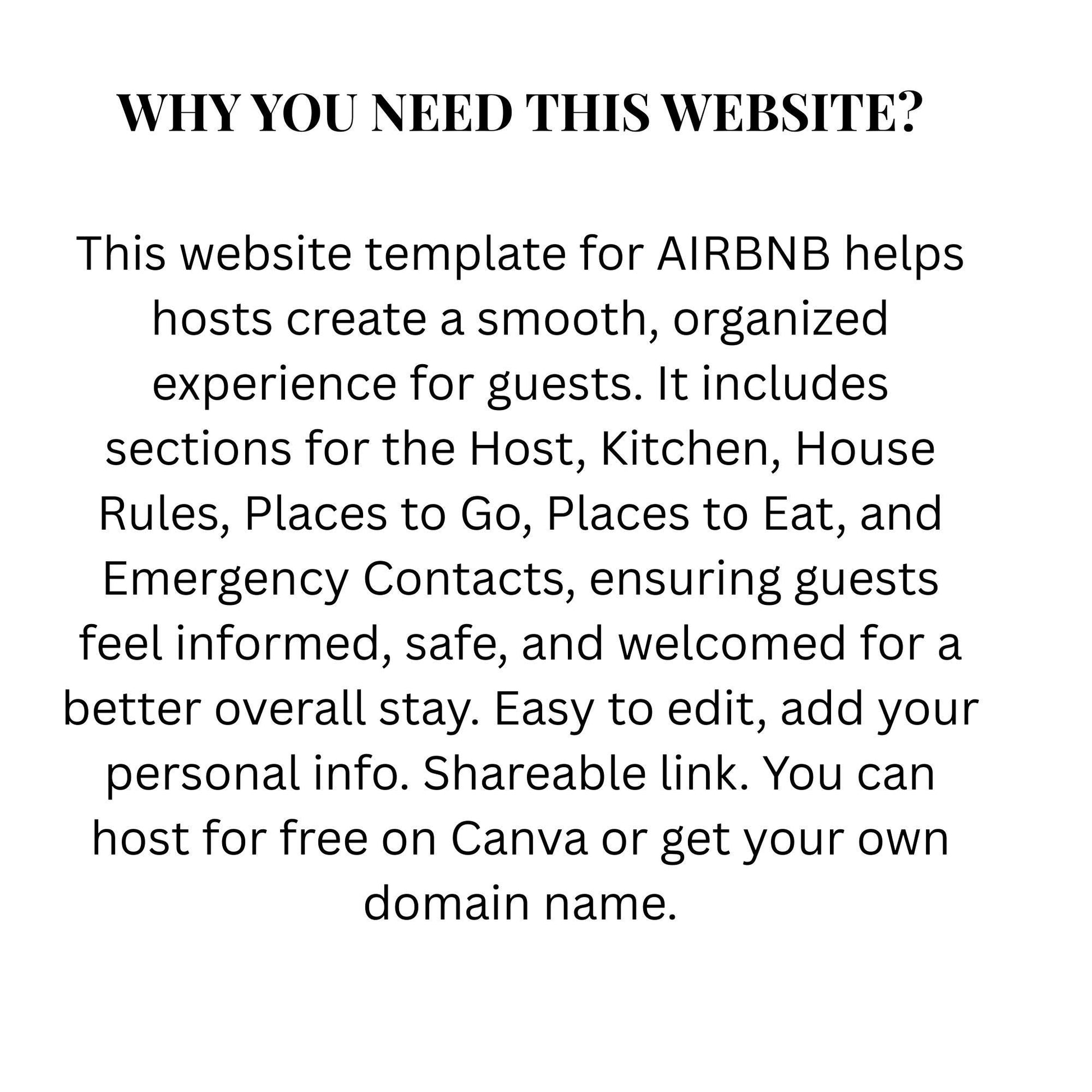 Looking to elevate your Airbnb hosting game? This website template is a must-have for Airbnb hosts and property managers! Designed to streamline guest communication, this customizable template includes sections for an **About Host**, **Kitchen** details, **House Rules**, **Places to Go**, **Places to Eat**, and **Emergency Contacts**.