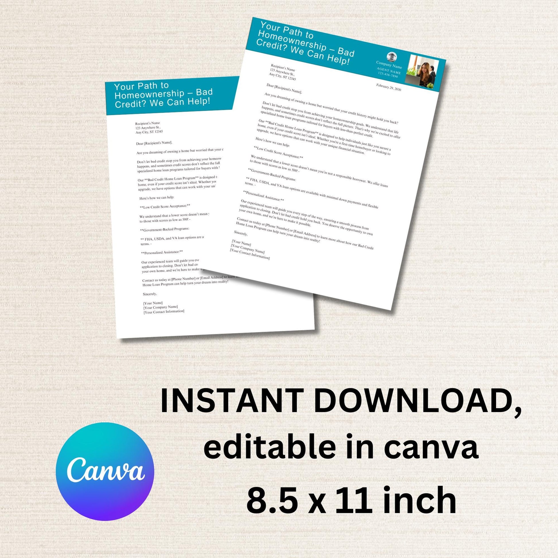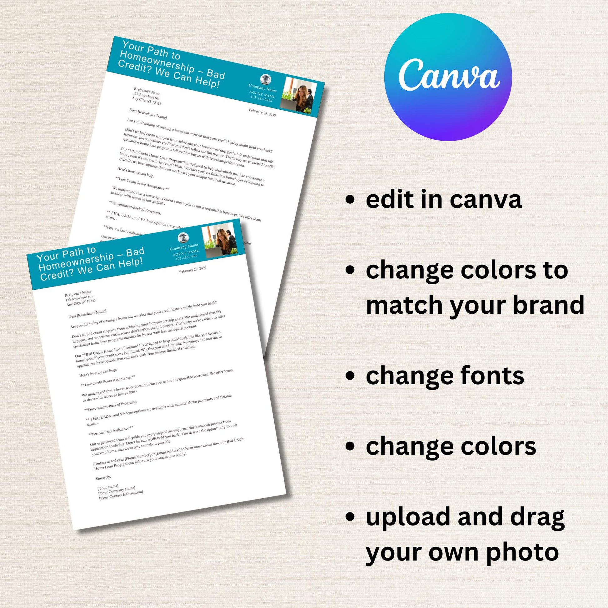 - 1 Fully Editable Bad Credit Mortgage Marketing Letter Template, Editable in canva.