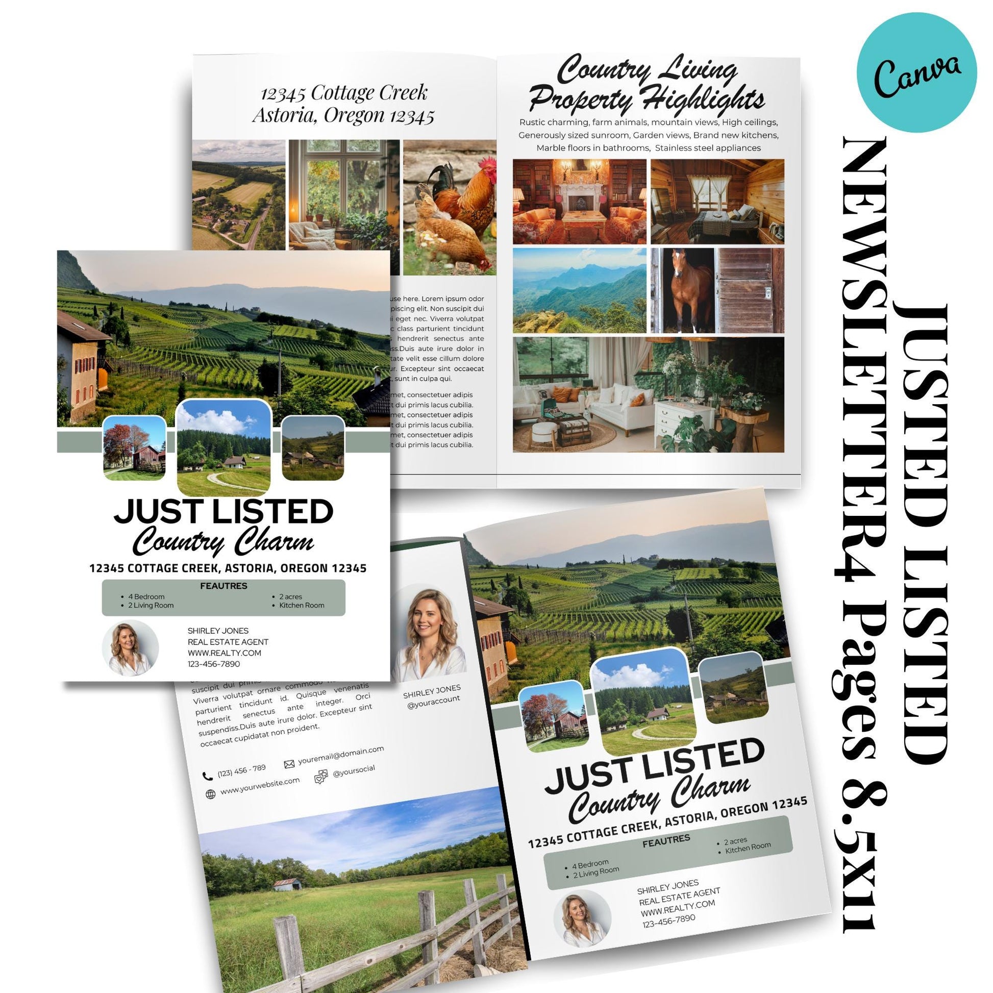 Just Listed 4 page Newsletter Template, Real Estate Property Listing Presentation Editable Canva Edit, Country Charm Just Listed Property