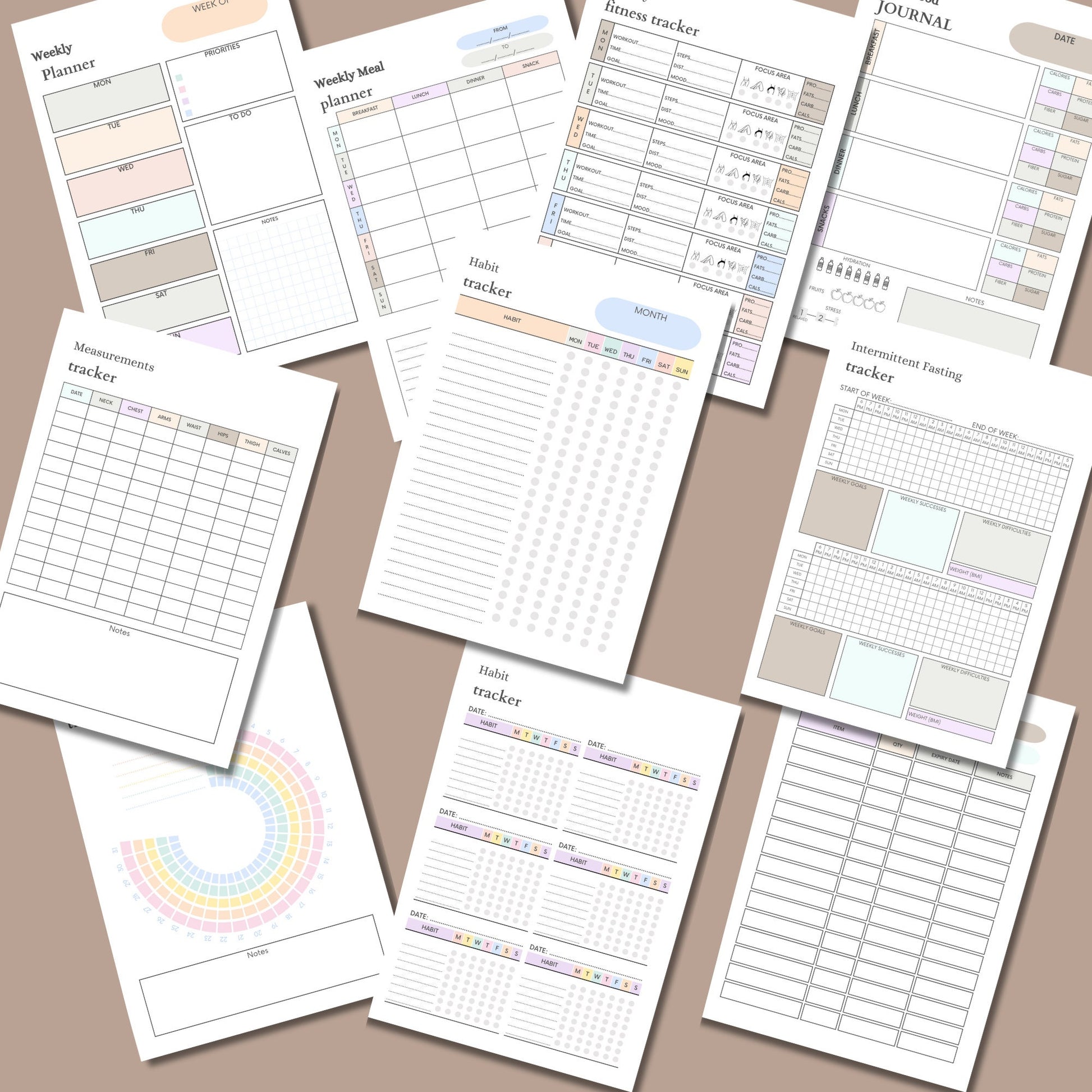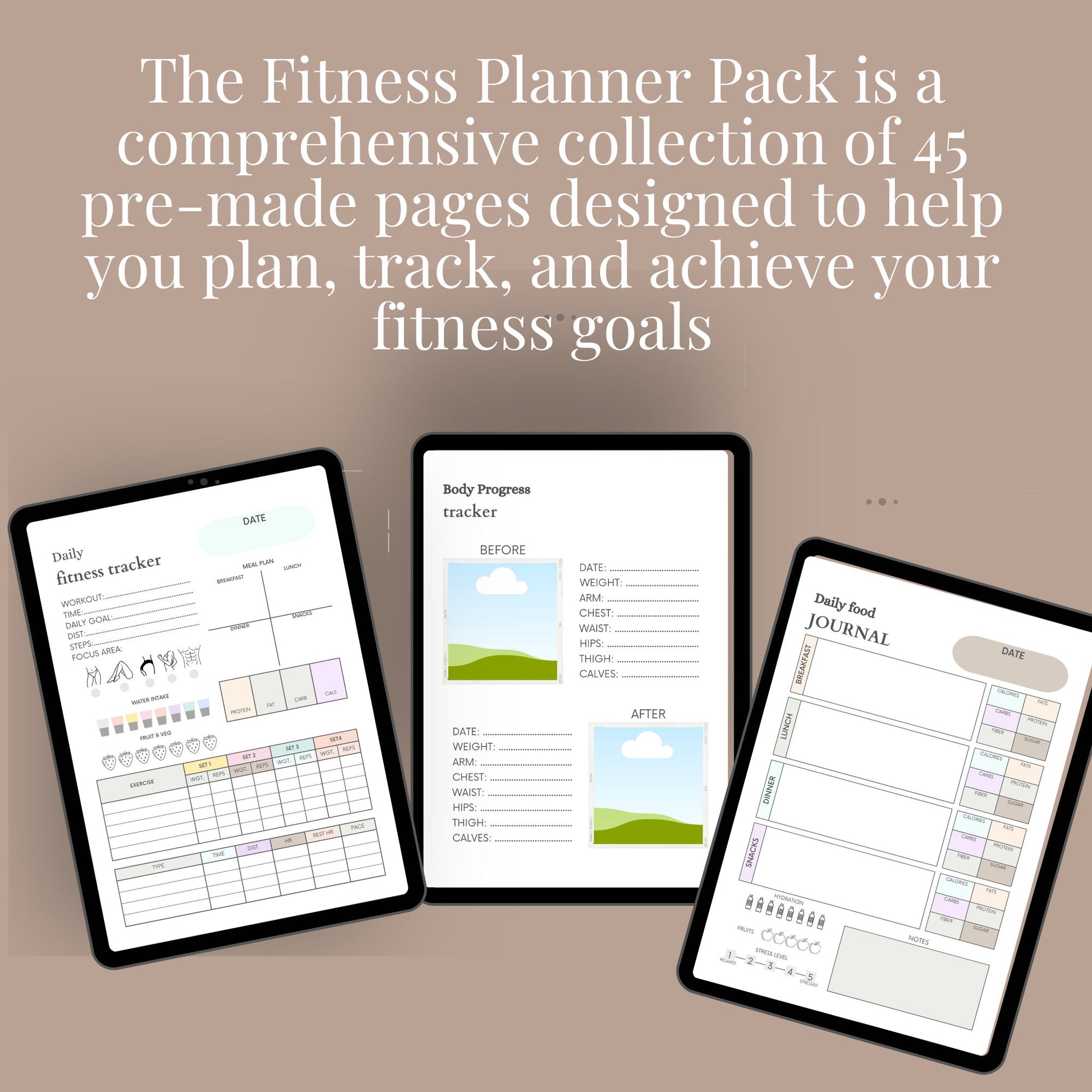 The Fitness Planner Pack is a comprehensive collection of 45 pre-made pages designed to help you plan, track, and achieve your fitness goals. This pack includes a variety of templates for daily, weekly, and monthly fitness planning, as well as progress trackers, measurement charts, and workout logs.