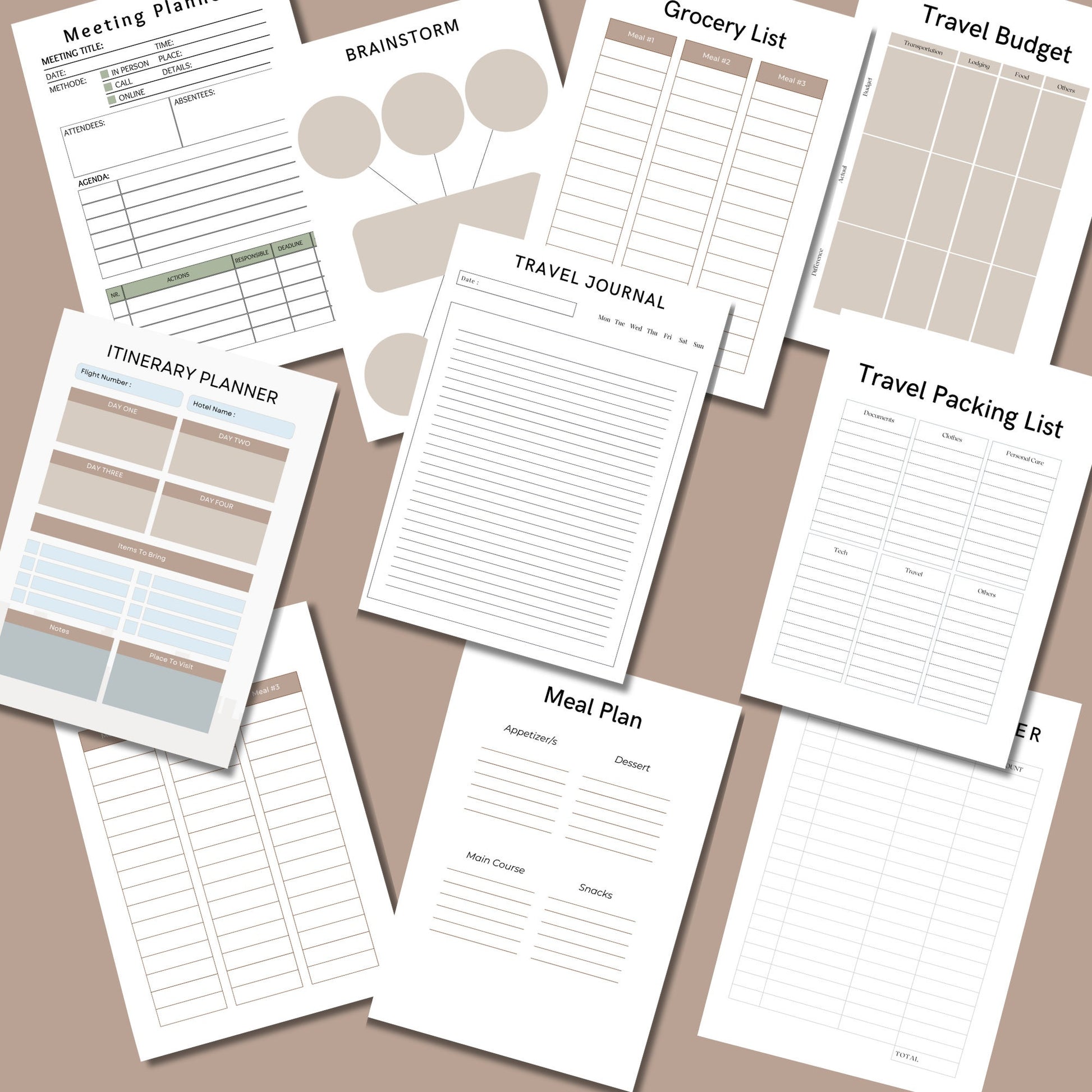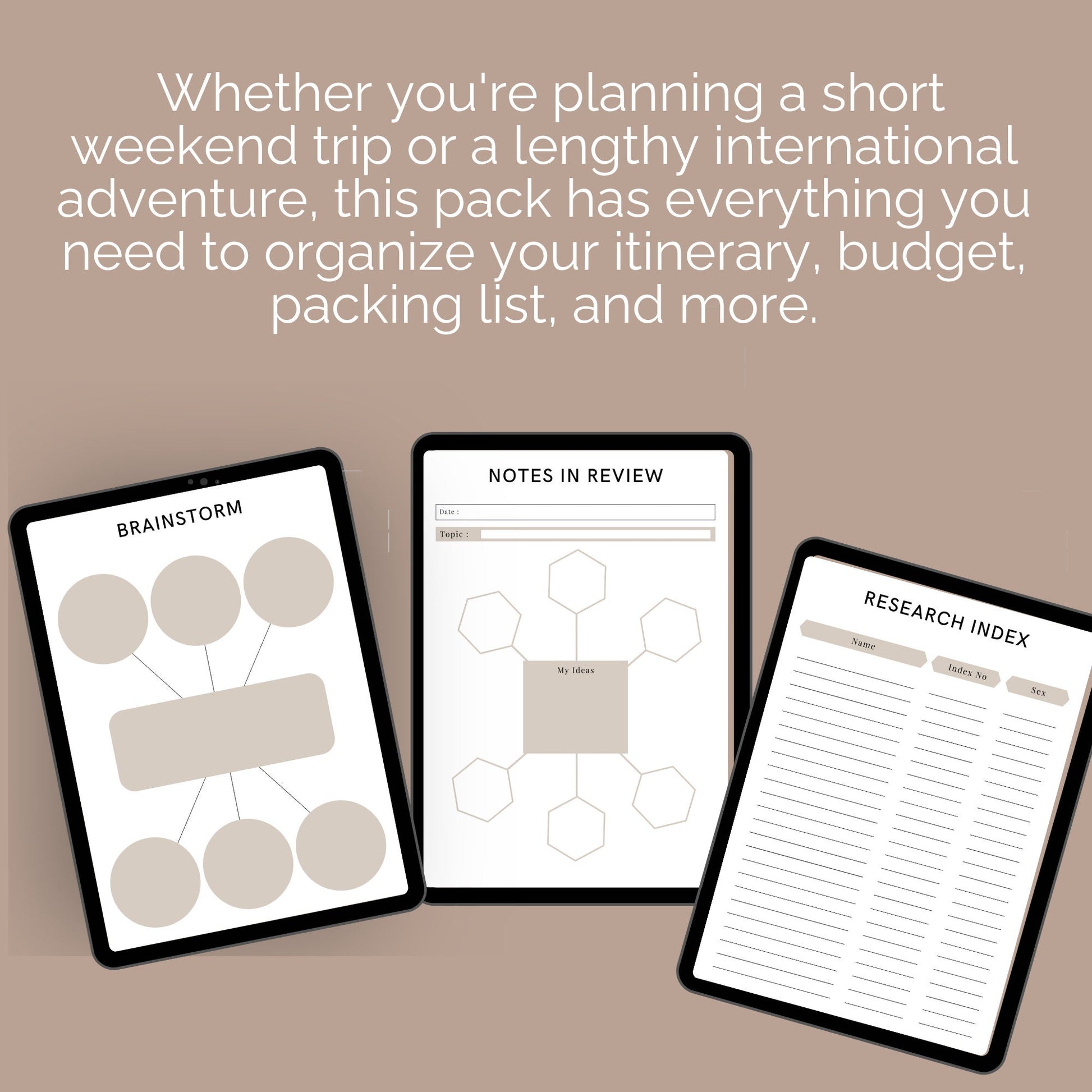 The Travel Planner Pack is a comprehensive 38-page set of travel planning tools that can be easily customized to fit your specific needs. Whether you're planning a short weekend trip or a lengthy international adventure, this pack has everything you need to organize your itinerary, budget, packing list, and more.