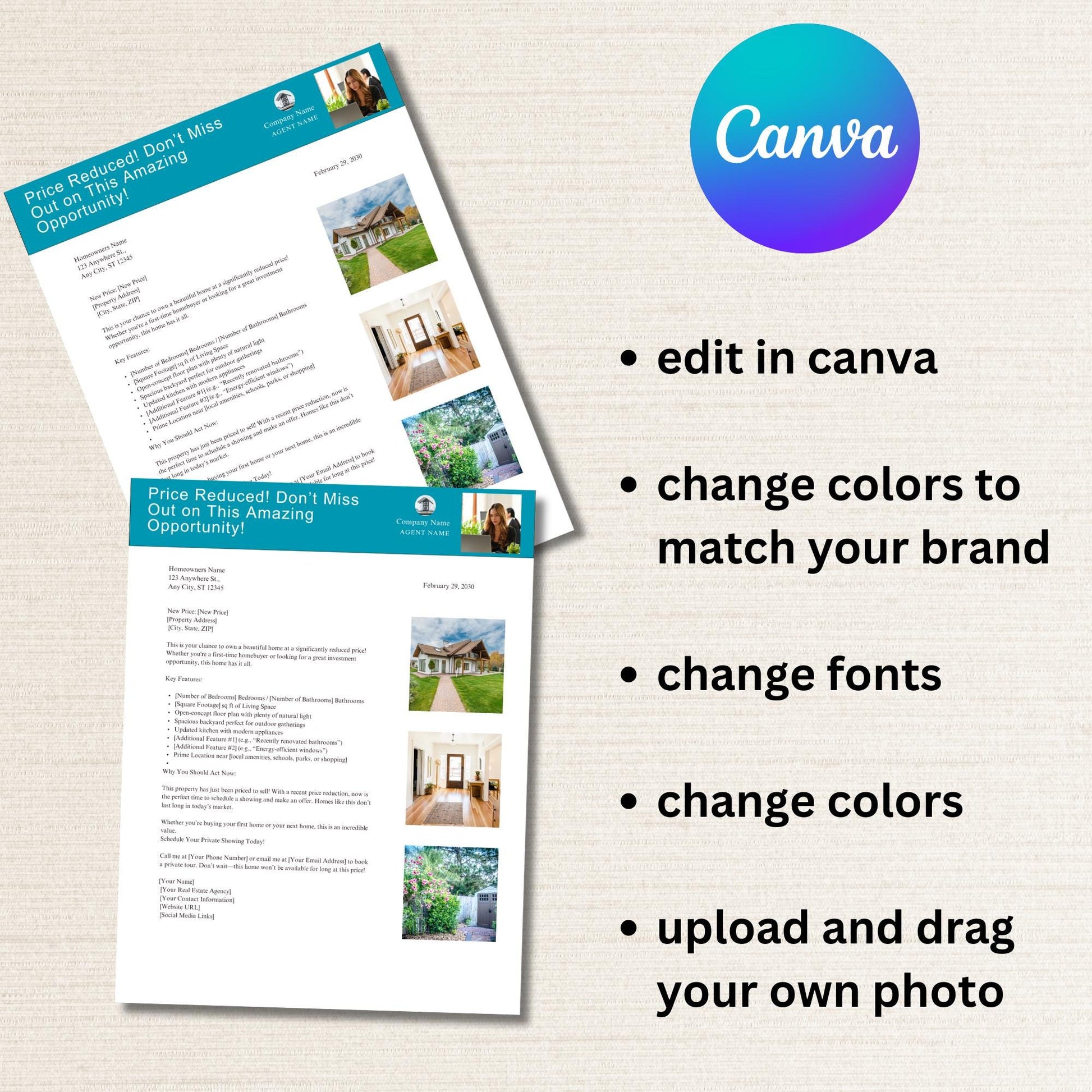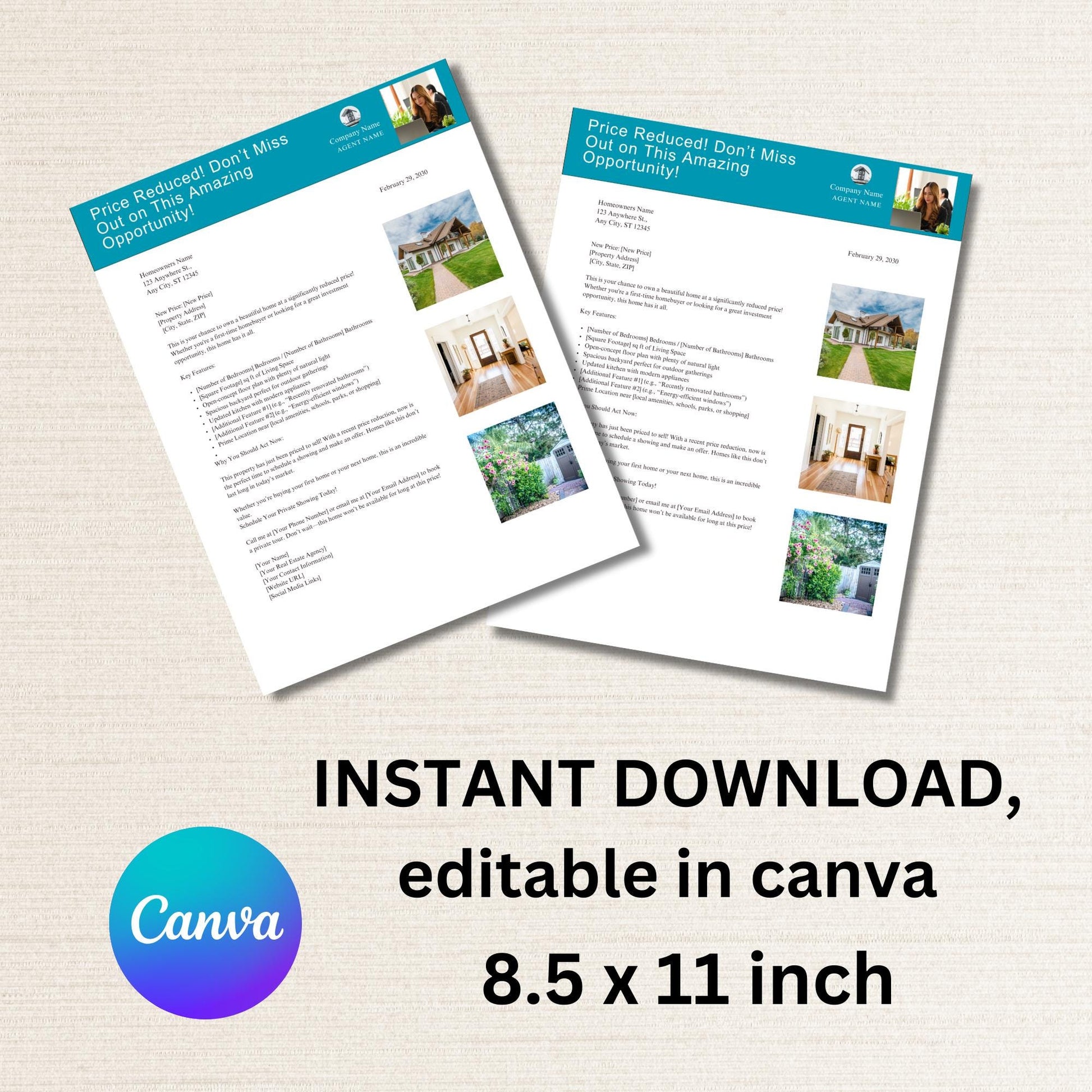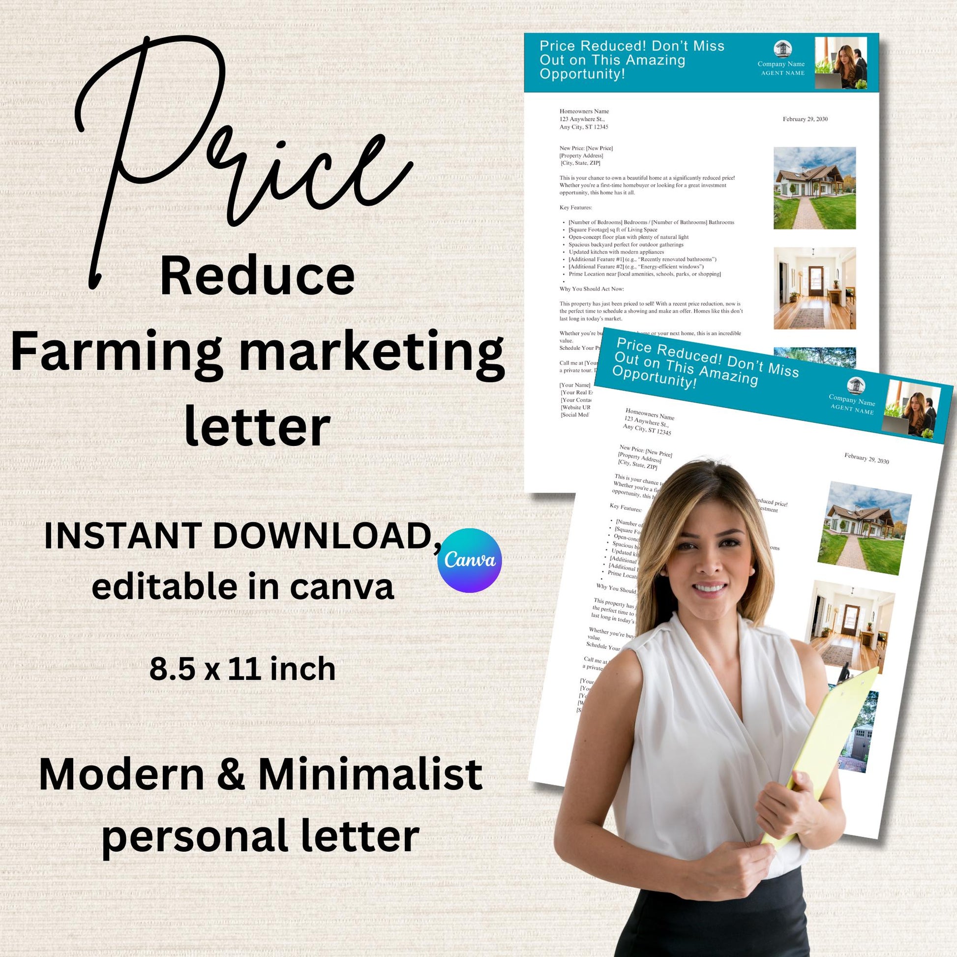 Price Reduced Flyer Farming Letter Template for Real Estate Agents Professional Design Editable in Canva, Modern and minimalist Letter Style