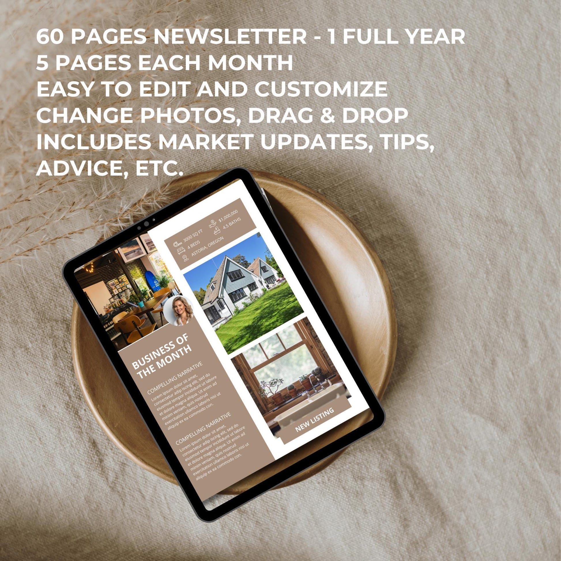 - **12 Monthly Newsletters**: Each month, you'll receive a beautifully designed 5-page newsletter packed with fresh content tailored to real estate trends, seasonal events, and community highlights.